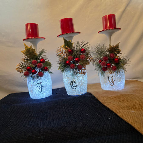 Glittering frosted snowmen with cozy hats, scarves, and glowing LED lights — each with its own personality. S$15 L$30