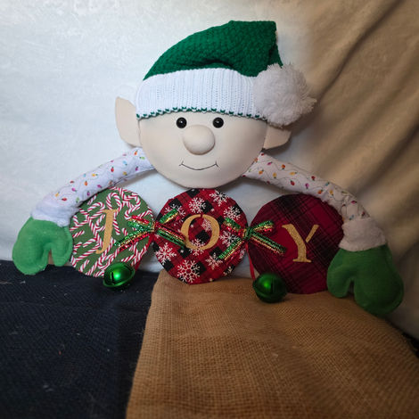 Green-hatted elf holding a playful “JOY” sign with holiday plaid and candy cane accents. $15